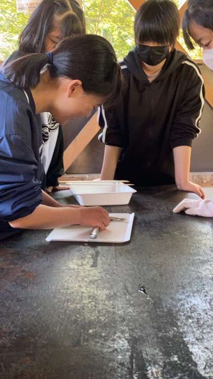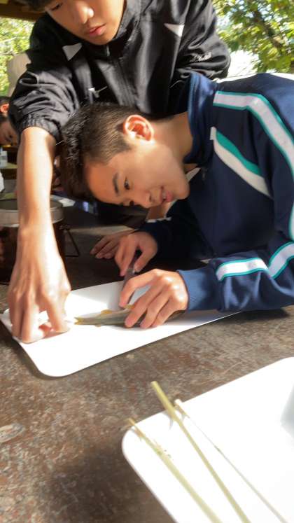 「魚つかみと料理体験」の様子。 捕まえた魚をさばいていきます。