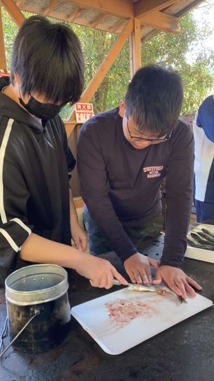 「魚つかみと料理体験」の様子。