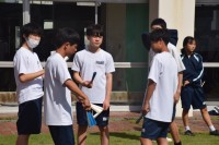 写真は国語科「書写」の授業の様子です。「国際交流」を行書で書くことに取り組んでいます。今年も、地域の書写の専門の方に特別非常勤講師として指導に参加していただき、国語科担当教師とTTで指導を行っています。生徒は、集中して作品を書き上げようと努めていました。