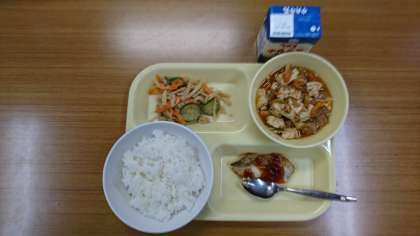 今日の献立は、「ご飯、牛乳、たらの中華あんかけ、マーボー豆腐、切り干し大根のごま酢あえ」でした。
