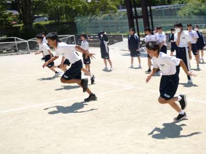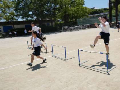 保健体育では陸上の単元に入っています。今日はハードル走をやりました。実習生の先生からハードルとハードルの間の歩幅について説明があり、それを意識して練習を行いました。最初は戸惑ってやりにくそうな印象でした。