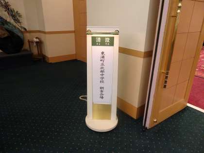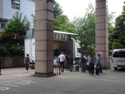 トラックに大きな荷物を積み込んだ生徒から朝食会場に向かっています。