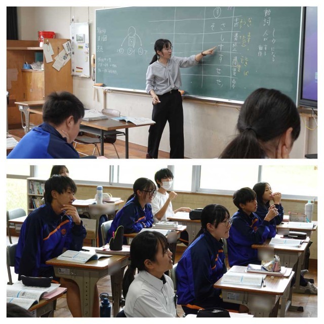 文法の学習です。未然形(話さない)・連用形(話します)・終止形(話す)・連体形(話すとき)・仮定形(話せば)・命令形(話せ)と活用します。(な)