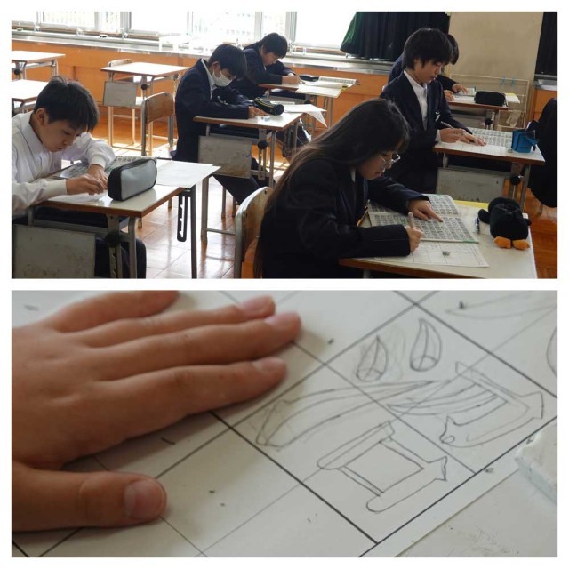 中学美術の定番、「レタリング」の学習です。明朝体、ゴシック体と取り組みます。(な)