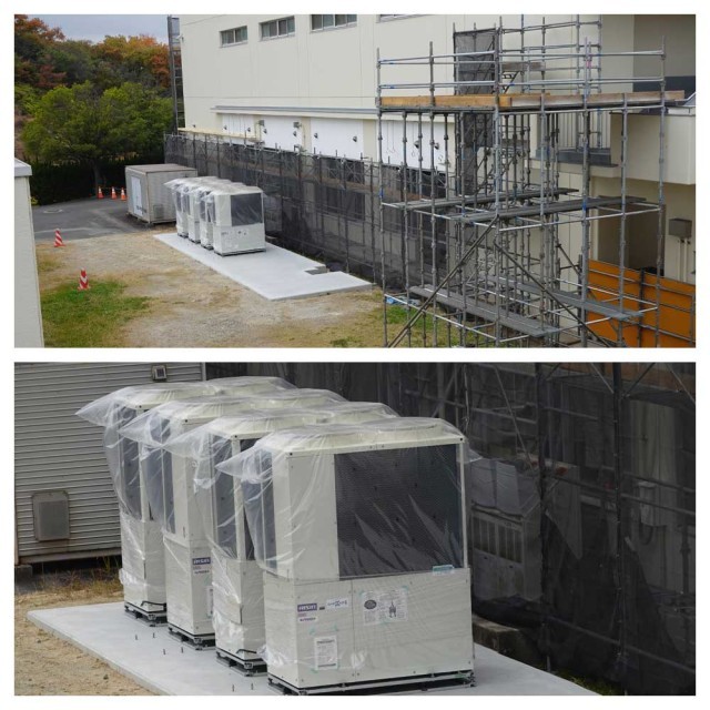 体育館空調工事が順調に進んでいます。久しぶりに現場を覗いてみたら、大きな室外機が設置されていました。(な)