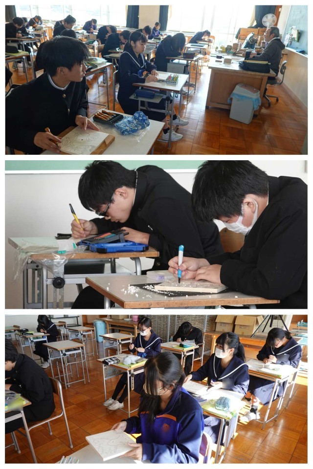 中学美術の最後の作品作りが本格的に始まったようです。手慣れた手つきで彫刻刀を巧みに操ります。(な)