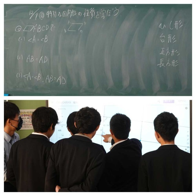 「正方形」「長方形」「ひし形」「台形」の中から、それぞれの条件に合う四角形を確認します。(な)