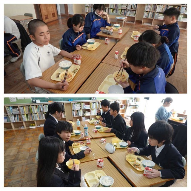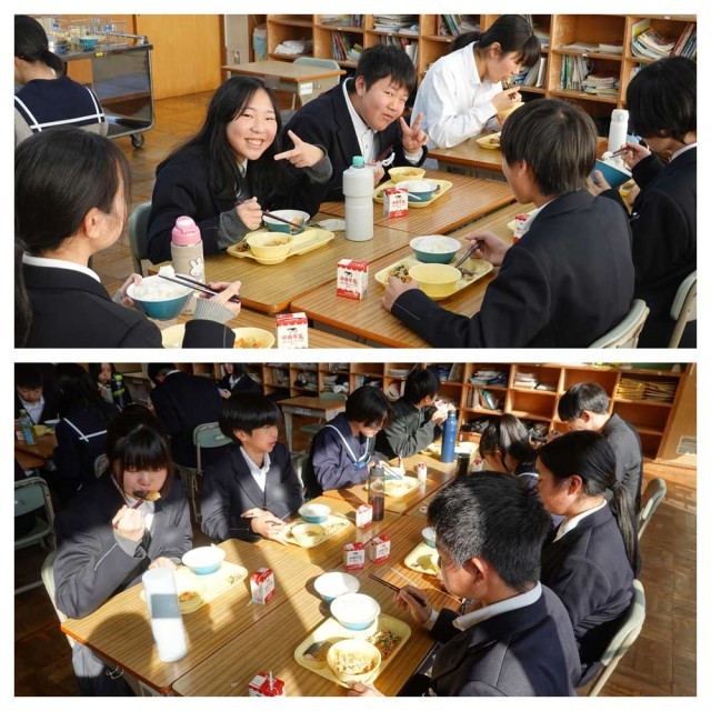 ある学年のある生徒は、給食時間にカメラを向けると決まって「笑顔」になります。楽しそうで、撮影しているこちらも笑顔になります。(な)