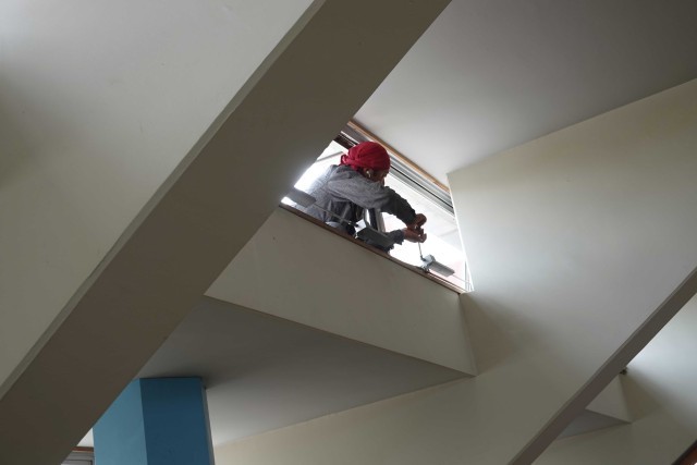 昇降口の天窓修理を行っていただいています。暑くなる前に直るといいですね。(な)