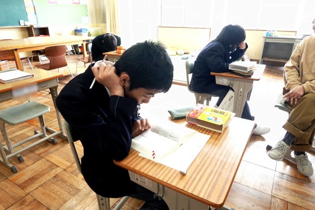 デジタル:タブレット端末を使えばすぐに分かってしまいますが、アナログ:辞書を使って漢字の学習です。(な)