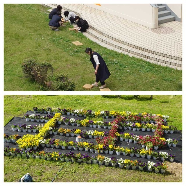 スプリングコンサートを予定通り行うため、雨に濡れた会場整備を先生たちで行いました。そして、パンジーは五線譜に音符とコンサート会場を彩りました。(な)