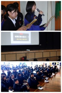 5時間目に授業です。1年生の英語では、動画を見ながら「Cap」「Cup」の発音の違い、同じ「ア」でもいろんな「ア」の発音の仕方があることを学んでいました。
